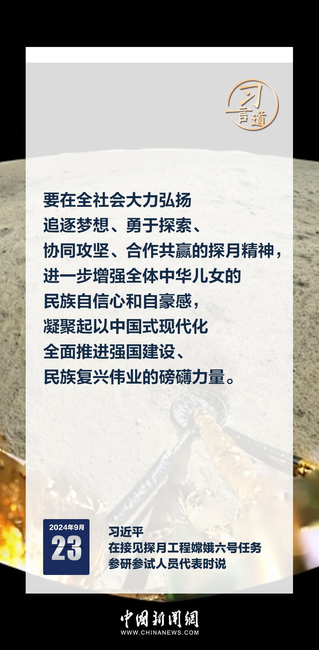 中共中央總書(shū)記、國(guó)家主席、中央軍委主席習(xí)近平23日在人民大會(huì)堂接見(jiàn)探月工程嫦娥六號(hào)任務(wù)參研參試人員代表時(shí)發(fā)表重要講話。習(xí)近平指出——