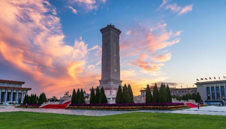 天安門廣場(chǎng),晚霞映襯下的人民英雄紀(jì)念碑