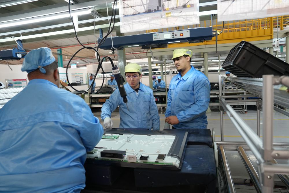 2024年8月14日,中方工程師(中)在南非開普敦的海信南非工業(yè)園電視機(jī)生產(chǎn)線上指導(dǎo)當(dāng)?shù)貑T工工作。工業(yè)園已為當(dāng)?shù)貏?chuàng)造1000多個(gè)直接就業(yè)機(jī)會(huì)、5000多個(gè)間接就業(yè)崗位,帶動(dòng)地區(qū)產(chǎn)業(yè)鏈發(fā)展。