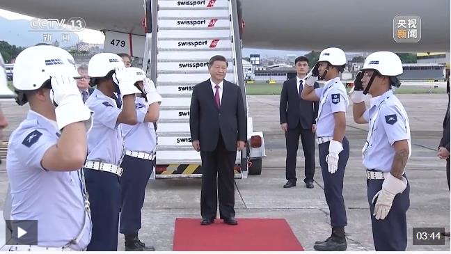 當?shù)貢r間11月17日下午,習主席乘專機抵達里約熱內(nèi)盧加里昂空軍基地。巴西政府高級官員熱情迎接。巴西空軍號手吹號致敬,禮兵分列紅毯兩側(cè)。
