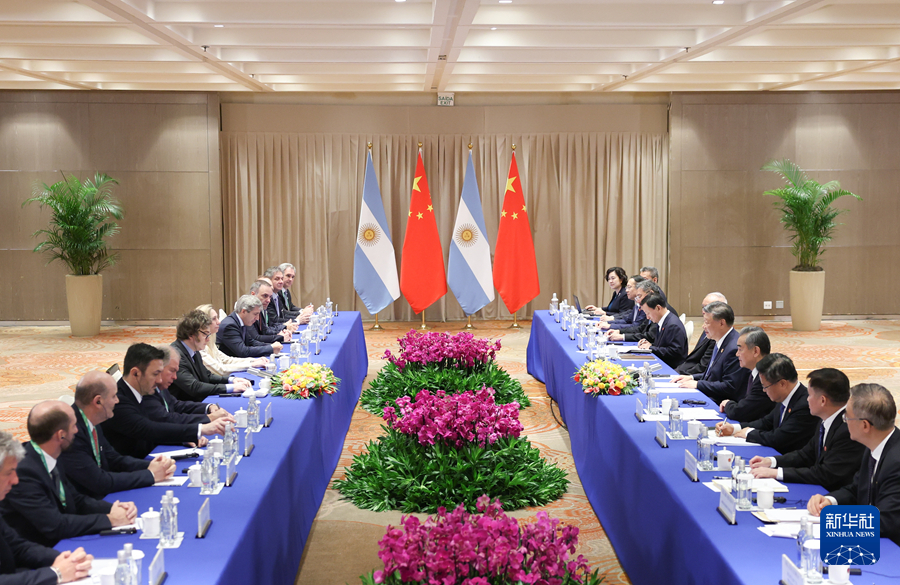 當?shù)貢r間11月19日上午,國家主席習近平在里約熱內盧出席二十國集團領導人峰會期間會見阿根廷總統(tǒng)米萊。新華社記者 丁海濤 攝
