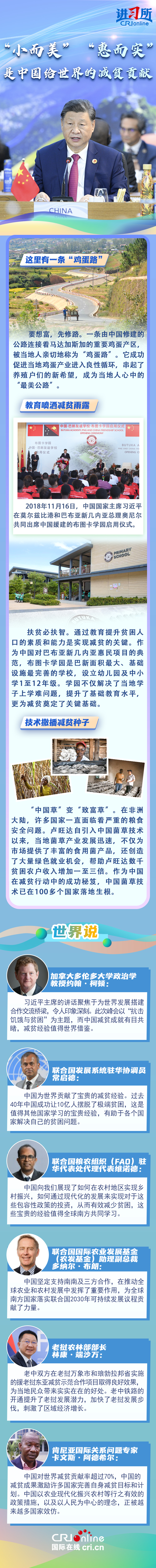 “世界繁榮穩(wěn)定不可能建立在貧者愈貧、富者愈富的基礎(chǔ)之上。”近年來,中國一直在用實(shí)際行動(dòng)與世界分享脫貧經(jīng)驗(yàn):與東盟國家共同開展鄉(xiāng)村減貧推進(jìn)計(jì)劃,在非洲開展基礎(chǔ)設(shè)施建設(shè)和農(nóng)業(yè)、醫(yī)療等技術(shù)合作援助項(xiàng)目,在拉美援建農(nóng)業(yè)技術(shù)中心......一批批“小而美”“惠而實(shí)”的民生項(xiàng)目落地生根,幫助當(dāng)?shù)孛癖姅[脫貧困。多國人士表示,中國成功打贏脫貧攻堅(jiān)戰(zhàn)具有世界意義,不僅為發(fā)展中國家提供了借鑒經(jīng)驗(yàn),更有助于推動(dòng)建設(shè)一個(gè)共同發(fā)展的公正世界。