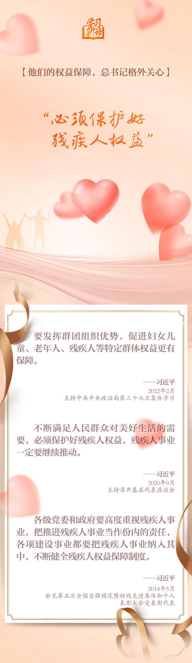 我國有8500萬殘疾人。在習(xí)近平總書記心中,殘疾人是一個(gè)特殊困難的群體,需要格外關(guān)心、格外關(guān)注。總書記的一句句溫暖話語、一次次深情囑托,讓廣大殘疾人心田滋潤、滿懷希望。
