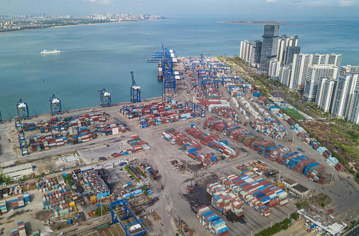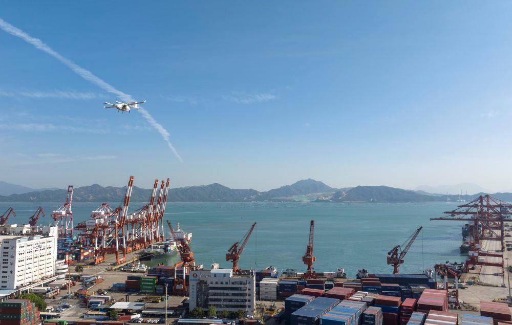 △無(wú)人機(jī)搭載快件從珠海飛抵深圳蛇口集裝箱碼頭起降點(diǎn)。