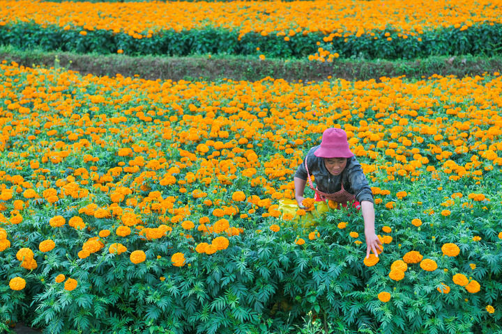 2024年7月30日,村民在貴州省威寧縣雙龍鎮(zhèn)高坡村采摘萬(wàn)壽菊。新華社記者 楊文斌 攝