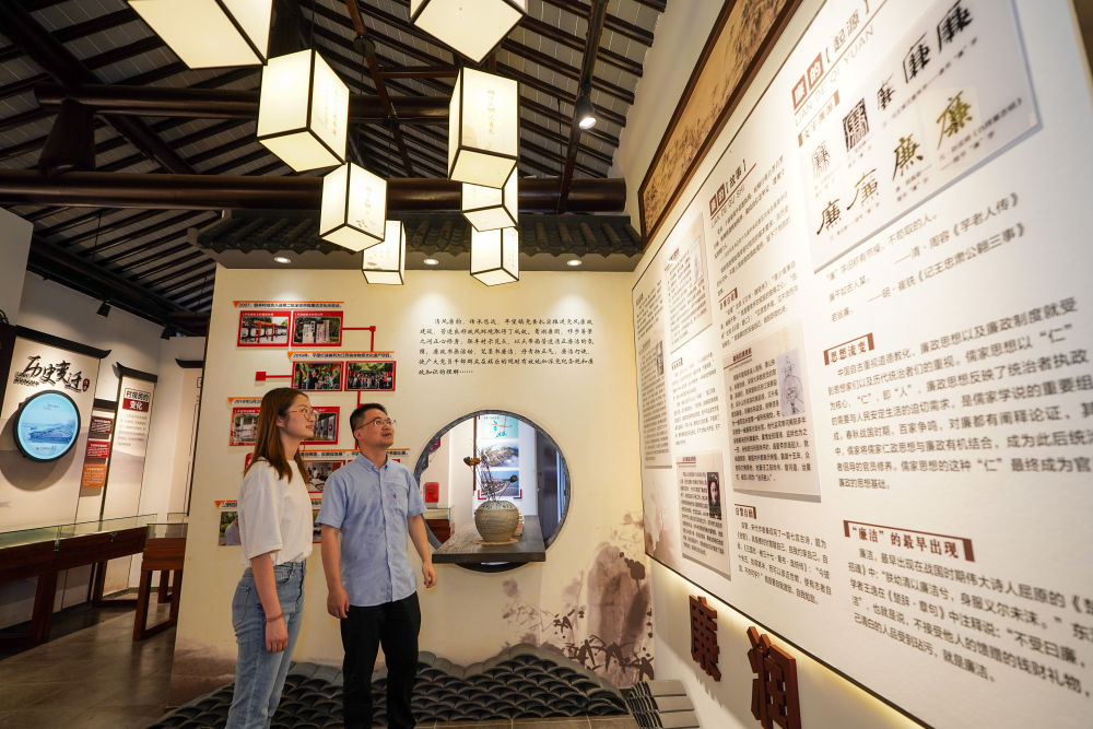 參觀者在蘇州市吳江區(qū)平望鎮(zhèn)廉潔教育基地鶯湖廉園內參觀(2024年7月4日攝)。