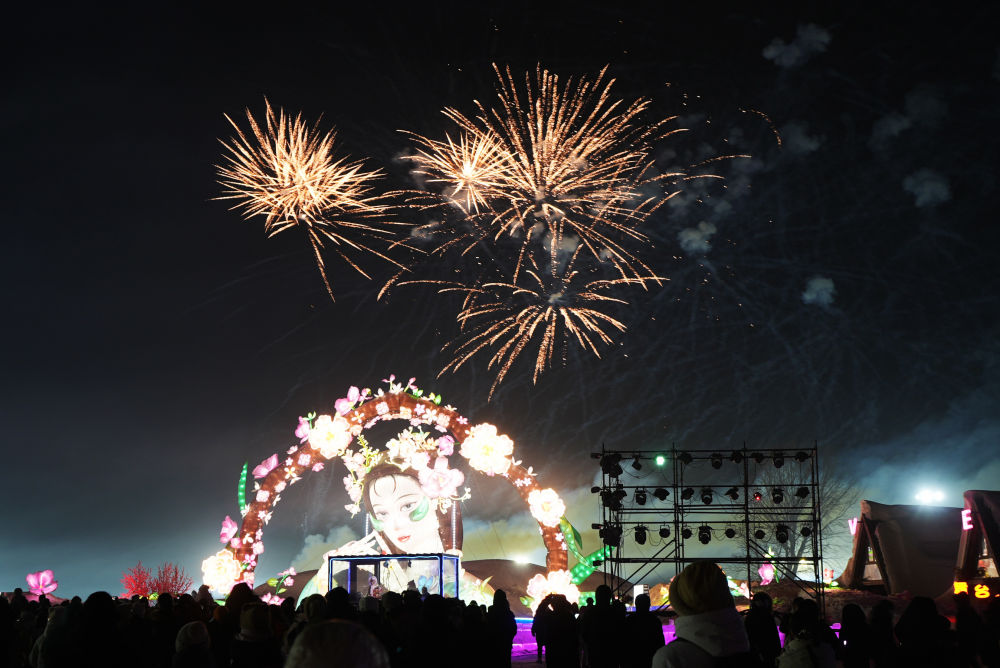 2025年1月12日,游客們?cè)谏蜿?yáng)沈北新區(qū)稻夢(mèng)小鎮(zhèn)觀(guān)看焰火表演。