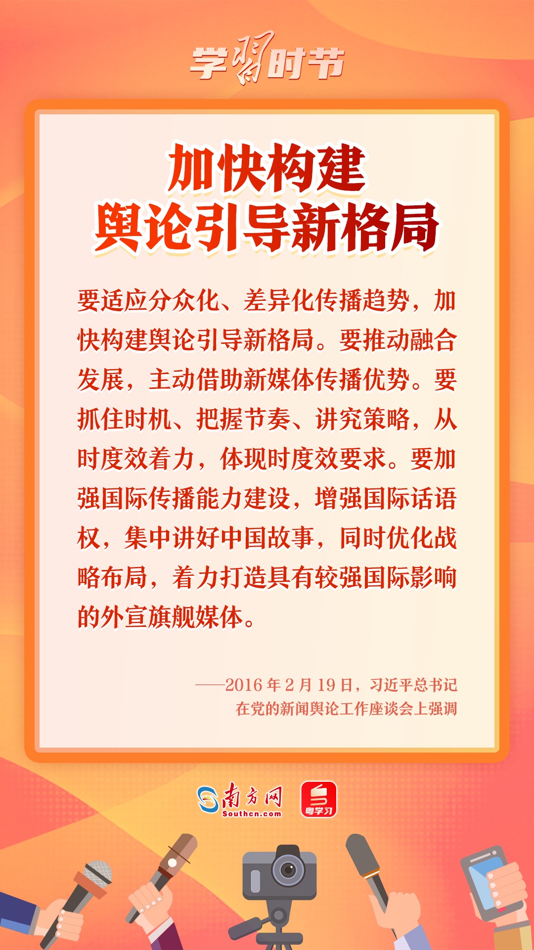 2016年2月19日,習(xí)近平總書記主持召開(kāi)黨的新聞?shì)浾摴ぷ髯剷?huì)并發(fā)表重要講話。他強(qiáng)調(diào),“黨的新聞?shì)浾摴ぷ魇屈h的一項(xiàng)重要工作,是治國(guó)理政、定國(guó)安邦的大事”。