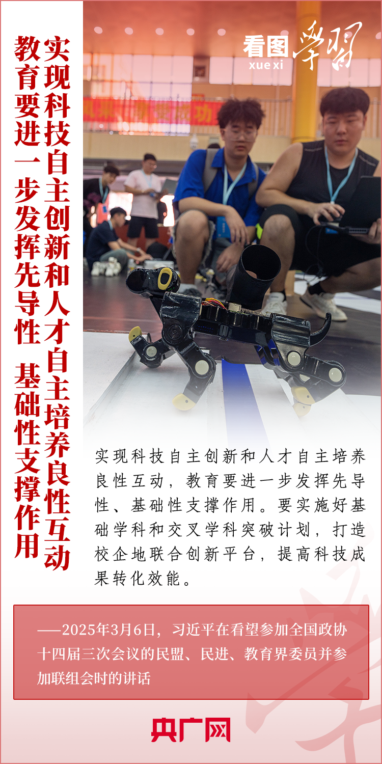 “建設(shè)教育強(qiáng)國(guó)、科技強(qiáng)國(guó)、人才強(qiáng)國(guó),是全黨全社會(huì)的共同責(zé)任?!?月6日,習(xí)近平總書記在看望參加全國(guó)政協(xié)十四屆三次會(huì)議的民盟、民進(jìn)、教育界委員并參加聯(lián)組會(huì)時(shí)發(fā)表重要講話??倳浘妥龊媒逃⒖萍?、人才工作作出深刻闡釋,強(qiáng)調(diào)必須深刻把握中國(guó)式現(xiàn)代化對(duì)教育、科技、人才的需求,強(qiáng)化教育對(duì)科技和人才的支撐作用,進(jìn)一步形成人才輩出、人盡其才、才盡其用的生動(dòng)局面。一起來學(xué)習(xí)!