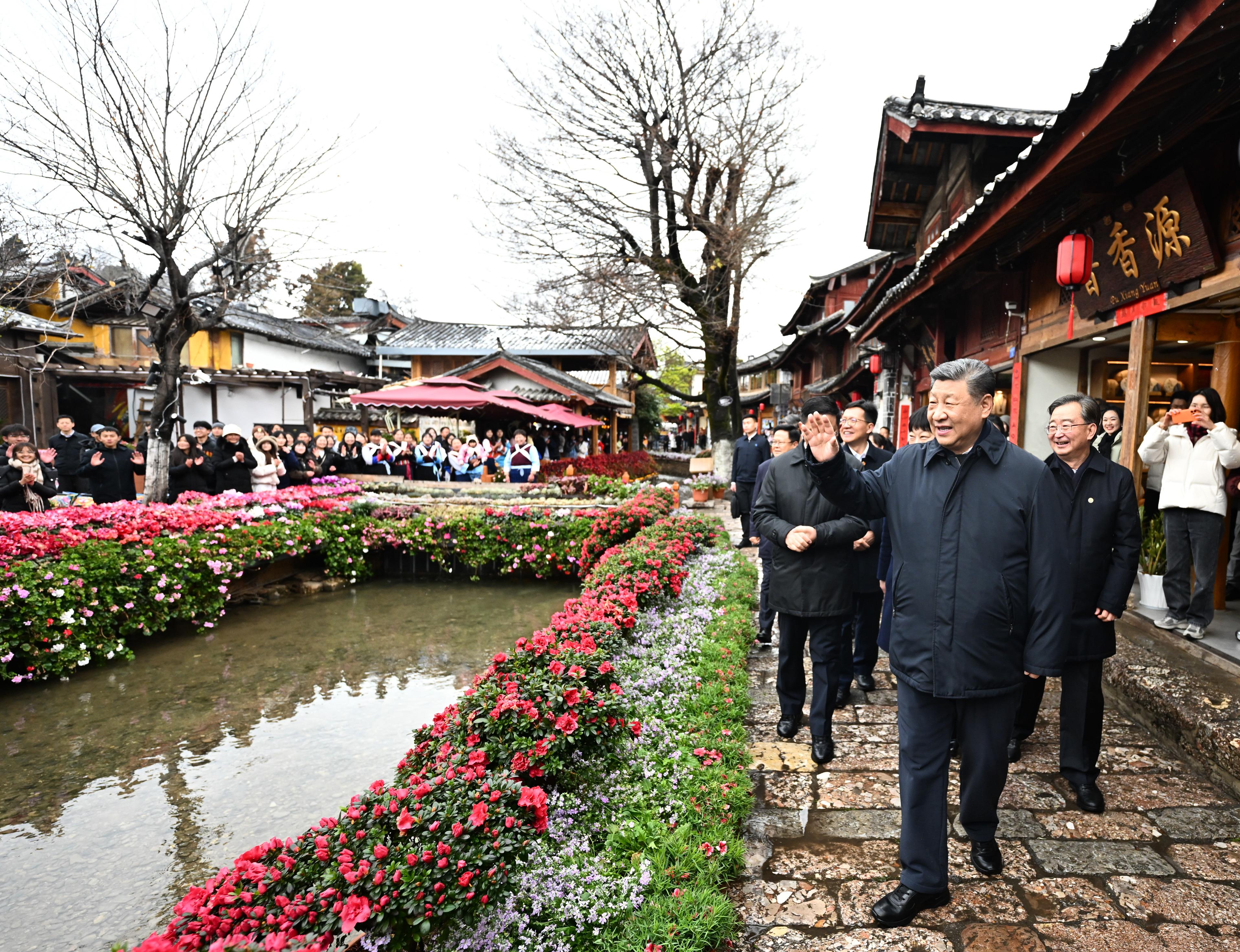 △2025年3月19日,習(xí)近平總書記在云南麗江古城考察時(shí),與居民、游客互動交流。