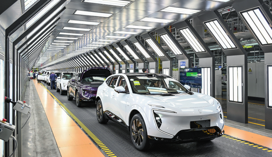 位于重慶市渝北區(qū)的長安汽車數(shù)智工廠總裝車間拍攝的即將下線的新能源汽車(2025 年 3 月 6 日攝) 王全超攝 / 本刊