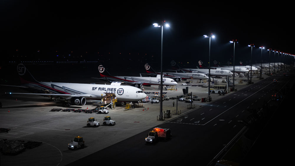 2024年5月25日凌晨,工人在湖北鄂州花湖國(guó)際機(jī)場(chǎng)停機(jī)坪裝卸貨物。鄂州花湖國(guó)際機(jī)場(chǎng)于2022年7月建成投運(yùn),是亞洲首個(gè)專業(yè)貨運(yùn)樞紐機(jī)場(chǎng)。截至2025年1月26日,鄂州花湖國(guó)際機(jī)場(chǎng)已開(kāi)通37條國(guó)際貨運(yùn)航線和66條國(guó)內(nèi)貨運(yùn)航線。