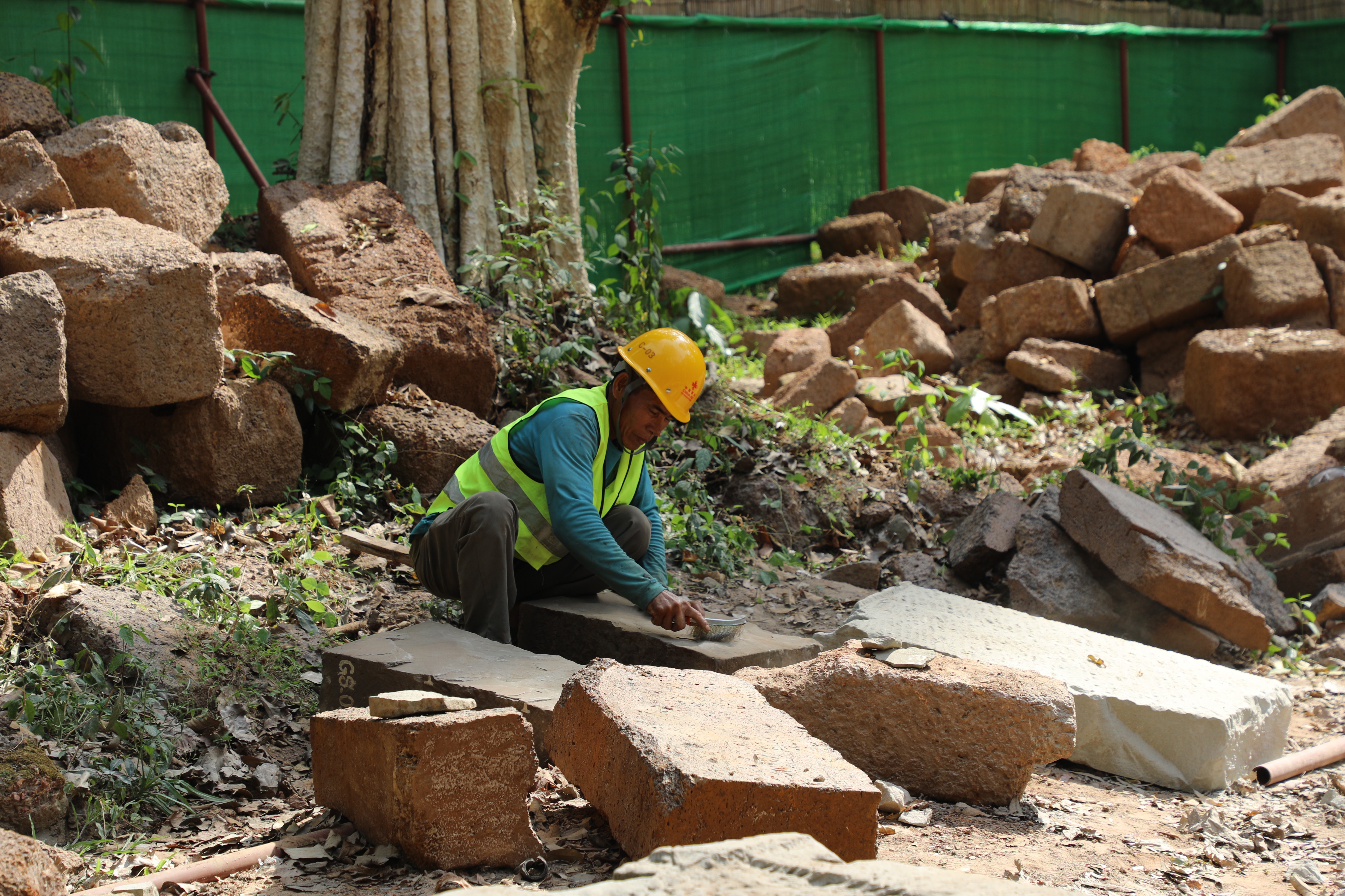 一名柬埔寨工人正在王宮遺址修復(fù)現(xiàn)場工作。(人民日報記者曹師韻 攝)
