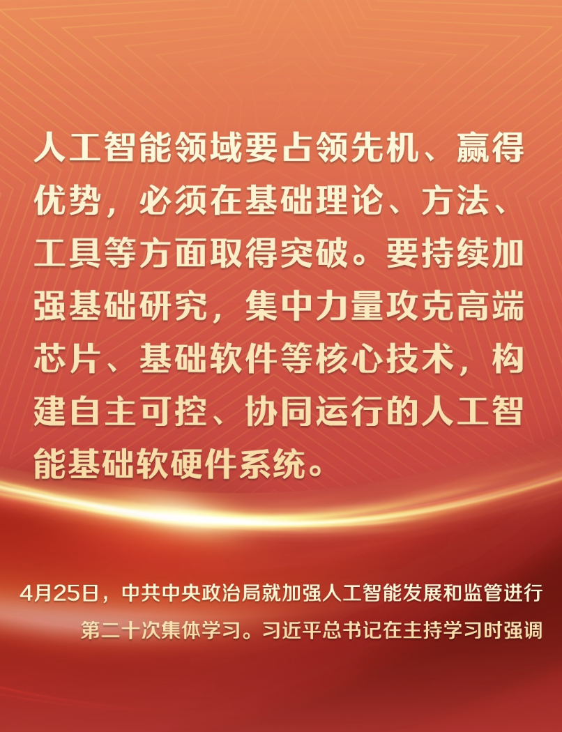 就在4天前,4月25日下午,中共中央政治局就加強人工智能發(fā)展和監(jiān)管進行第二十次集體學習。習近平總書記在主持學習時強調: