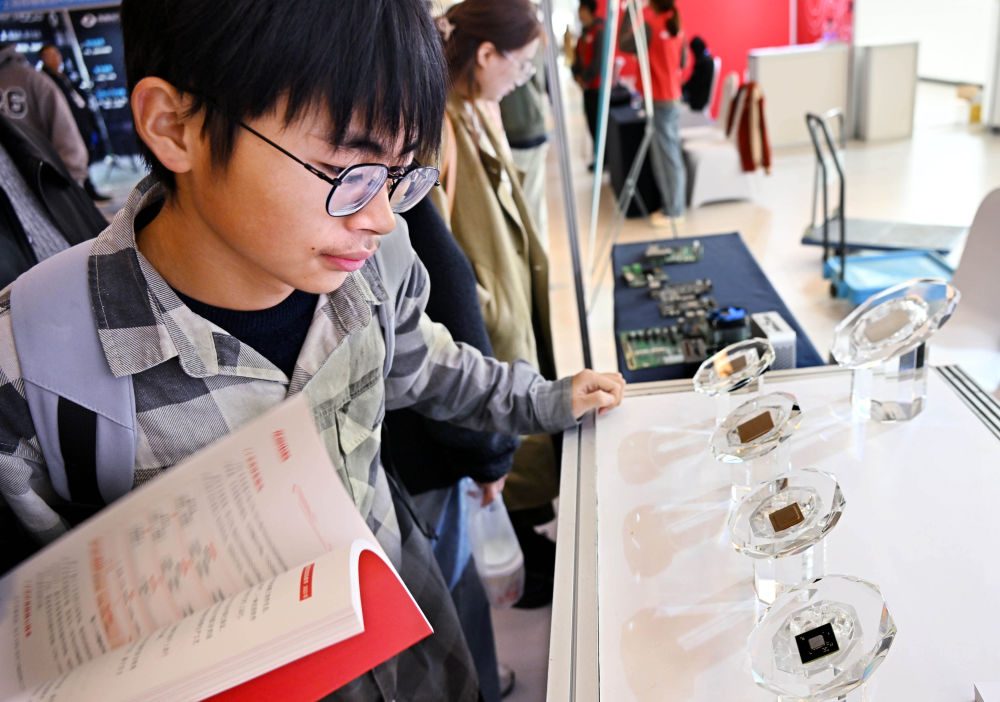 2024年11月2日,與會者在2024中國自動化大會展覽區(qū)觀看國產芯片。當日,2024中國自動化大會在山東省青島市開幕。大會以“新質發(fā)展 智控未來”為主題,聚焦自動化與人工智能深度融合,探討新產業(yè)、新技術的創(chuàng)新發(fā)展。
