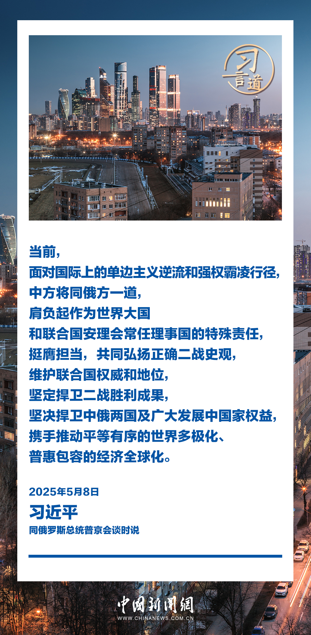 當(dāng)?shù)貢r間5月8日,俄羅斯總統(tǒng)普京同中國國家主席習(xí)近平在莫斯科克里姆林宮舉行會談。習(xí)近平指出——