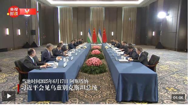當(dāng)?shù)貢r(shí)間6月17日上午,國家主席習(xí)近平在阿斯塔納出席第二屆中國-中亞峰會(huì)期間會(huì)見烏茲別克斯坦總統(tǒng)米爾濟(jì)約耶夫。