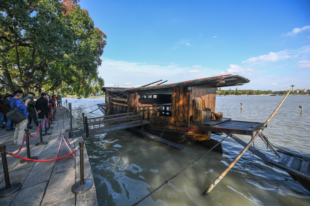 湖心島畔,紅船靜臥,船頭朝著太陽升起的方向,生動還原了中國共產(chǎn)黨誕生時的場景?!傲?xí)近平同志進了船艙,他有感而發(fā),說南湖是他向往已久的地方,這次來浙江工作,第一次就來南湖參觀,是非常有意義的事?!睍r任南湖革命紀(jì)念館講解員黃曉琦回憶。