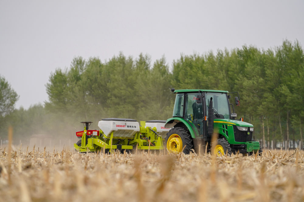 經(jīng)過多年試驗和推廣,東北逐步形成以秸稈覆蓋、少耕免耕為特點的吉林“梨樹模式”等多種行之有效的保護(hù)性耕作模式。這是2020年5月7日,吉林省四平市梨樹縣的農(nóng)民駕駛免耕播種機播種玉米。