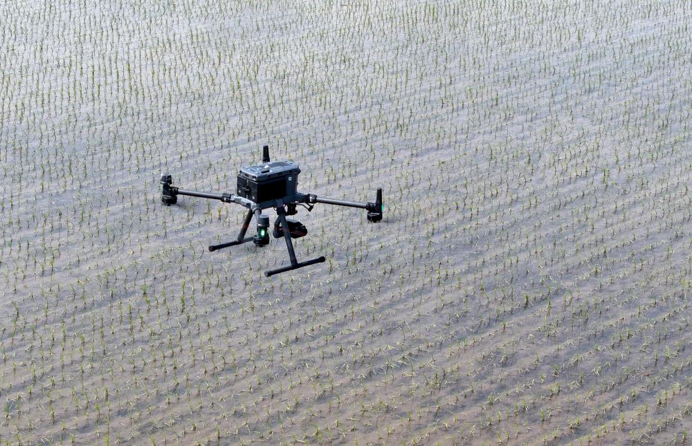 2025年5月21日,在黑龍江省北大荒農(nóng)業(yè)股份八五六分公司第六管理區(qū)農(nóng)業(yè)現(xiàn)代化示范區(qū),搭載多光譜、可見光攝像頭的無人機對水稻插秧后田塊進(jìn)行土壤墑情監(jiān)測(無人機照片)。
