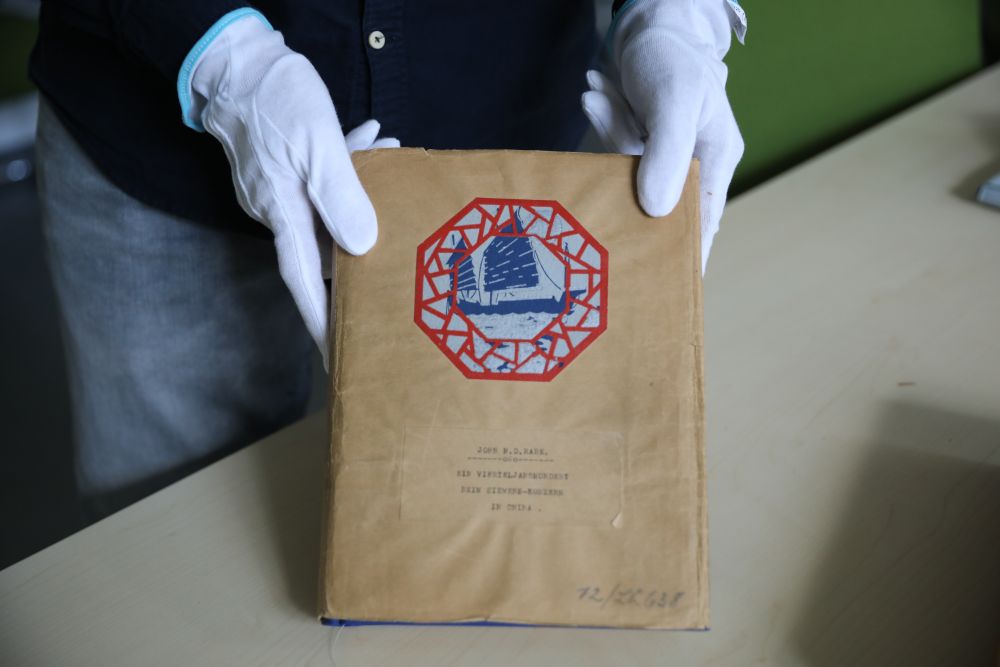 7月30日,在德國柏林的西門子歷史檔案館,歷史學(xué)家埃瓦爾德·布勒歇爾展示《拉貝日記》部分原件。新華社記者 杜哲宇 攝
