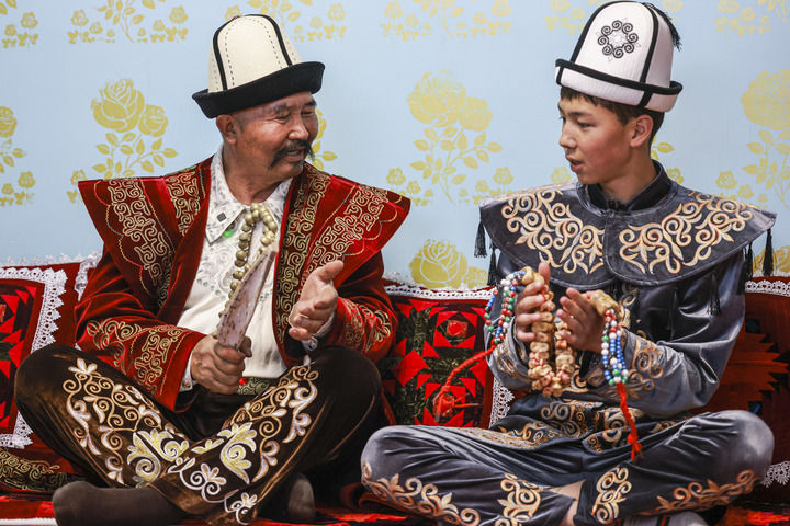 《瑪納斯》國家級非物質(zhì)文化遺產(chǎn)代表性傳承人江努日·圖日干巴依(左)教徒弟演唱《瑪納斯》(2025年4月21日攝)。新華社記者 王菲 攝