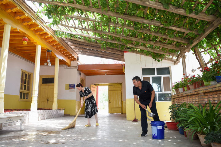 在新疆喀什地區(qū)疏附縣阿亞格曼干村,村民阿卜都克尤木·肉孜(右)和妻子在打掃庭院(2022年6月10日攝)。新華社記者 丁磊 攝