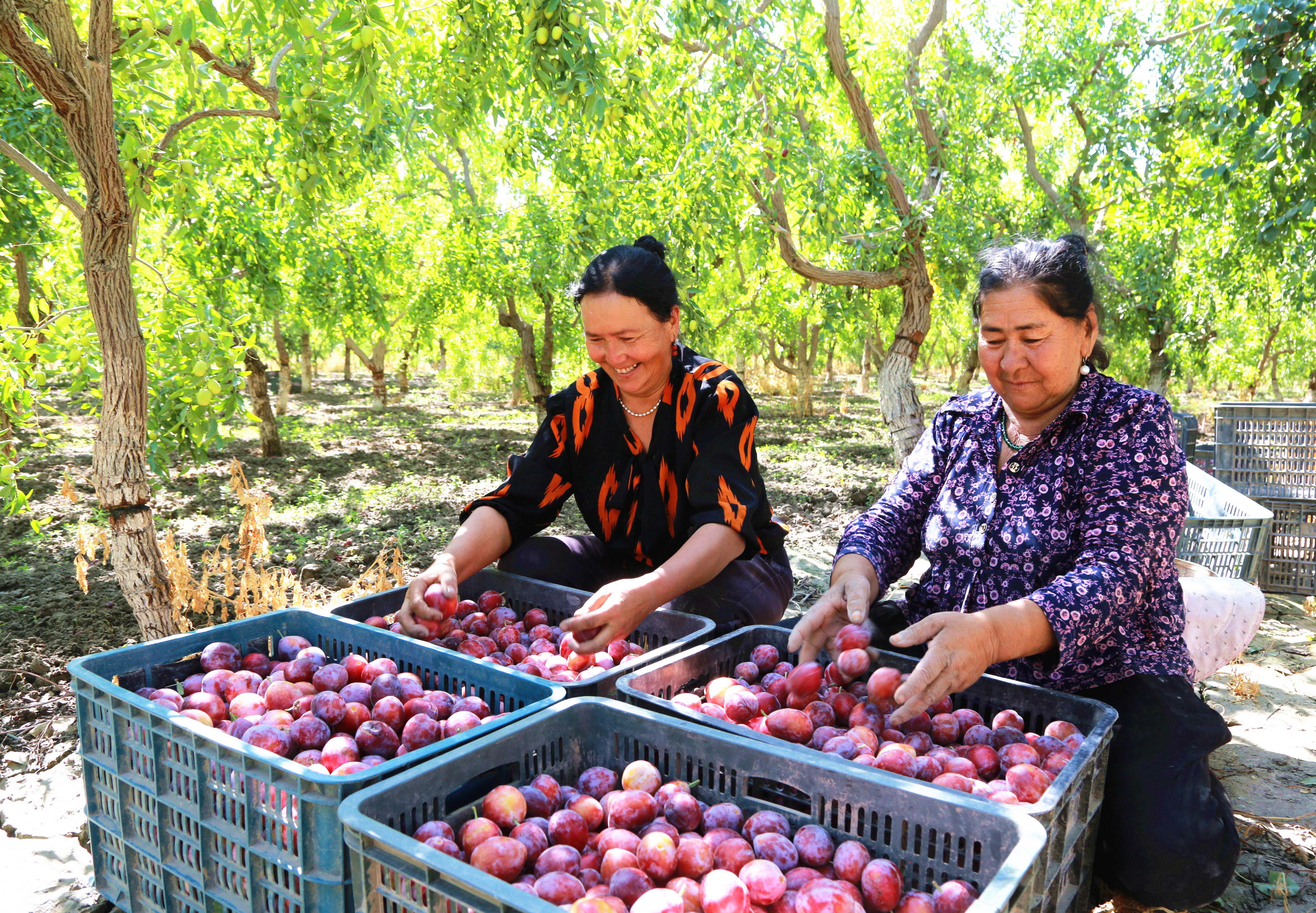 2025年8月19日,新疆阿克蘇地區(qū)阿瓦提縣塔木托格拉克鎮(zhèn)阿克亞村,果農分揀西梅。