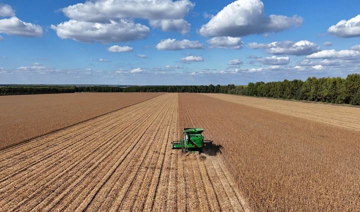 2025年9月19日,在北大荒集團(tuán)黑龍江格球山農(nóng)場(chǎng)有限公司大豆地塊,收獲機(jī)車在進(jìn)行收獲作業(yè)(無(wú)人機(jī)照片)。新華社發(fā)(陸文祥攝)
