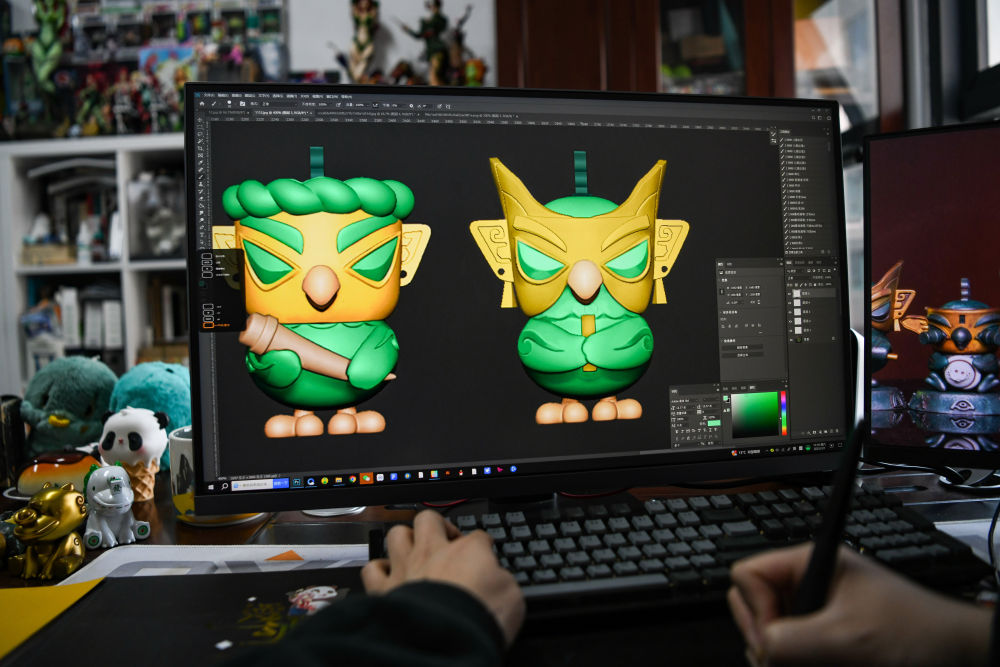 2025年3月1日,文創(chuàng)產(chǎn)品策劃運(yùn)營師曾舟在位于四川成都的辦公室內(nèi)完善文創(chuàng)產(chǎn)品細(xì)節(jié)。他以三星堆青銅神樹、青銅縱目面具、青銅獸面等文物為創(chuàng)作藍(lán)本,結(jié)合潮玩元素設(shè)計(jì)的文創(chuàng)作品廣受歡迎?!拔蚁胱龅牟皇峭婢呖煜?,而是有內(nèi)容、有溫度、有意義的文化IP,讓年輕一代隨手摸到沉淀千年的文化。”曾舟說。