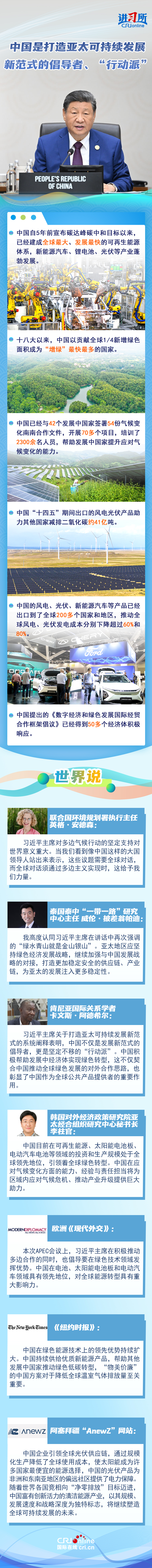“我們要本著對(duì)子孫后代負(fù)責(zé)的態(tài)度,加強(qiáng)各經(jīng)濟(jì)體綠色發(fā)展戰(zhàn)略對(duì)接,促進(jìn)優(yōu)質(zhì)綠色技術(shù)和產(chǎn)品自由流通,加快推動(dòng)發(fā)展方式綠色低碳轉(zhuǎn)型,積極應(yīng)對(duì)氣候變化?!?1月1日,中國(guó)國(guó)家主席習(xí)近平在亞太經(jīng)合組織第三十二次領(lǐng)導(dǎo)人非正式會(huì)議第二階段會(huì)議講話中提出,要堅(jiān)持綠色低碳,打造亞太可持續(xù)發(fā)展新范式。