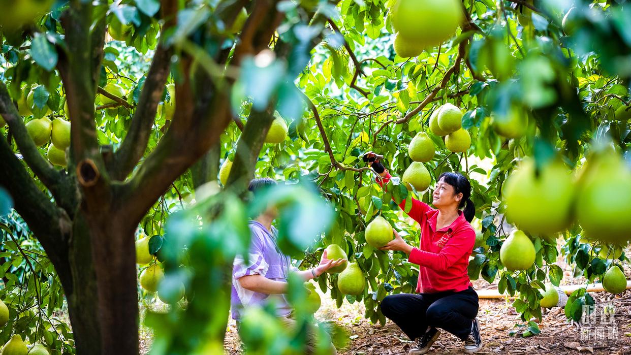 △南福金柚種植基地,柚林迎來豐收。(總臺記者吳媚苗、總臺央視記者鄂介甫拍攝)