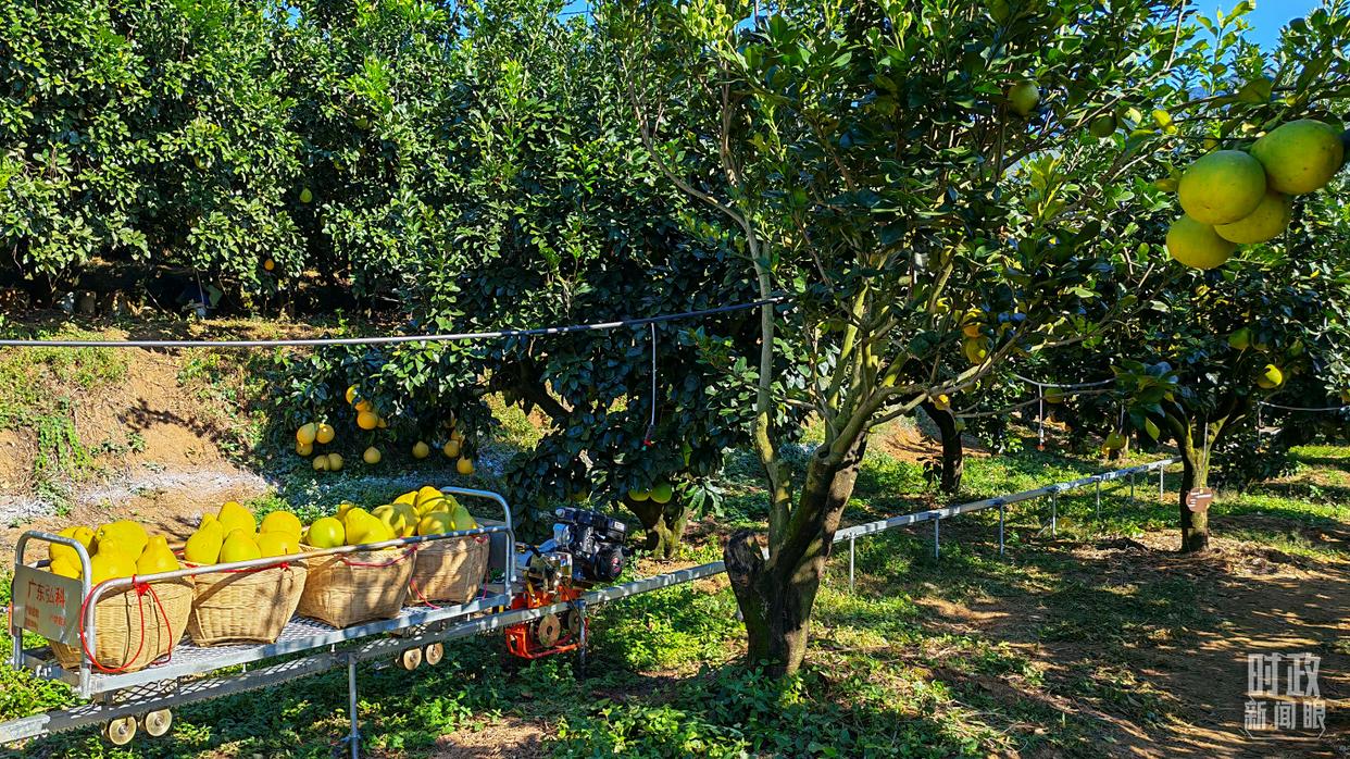 △金柚采摘運送用上了無人軌道車,可大大減輕人力負擔。(總臺央視記者郭鴻拍攝)