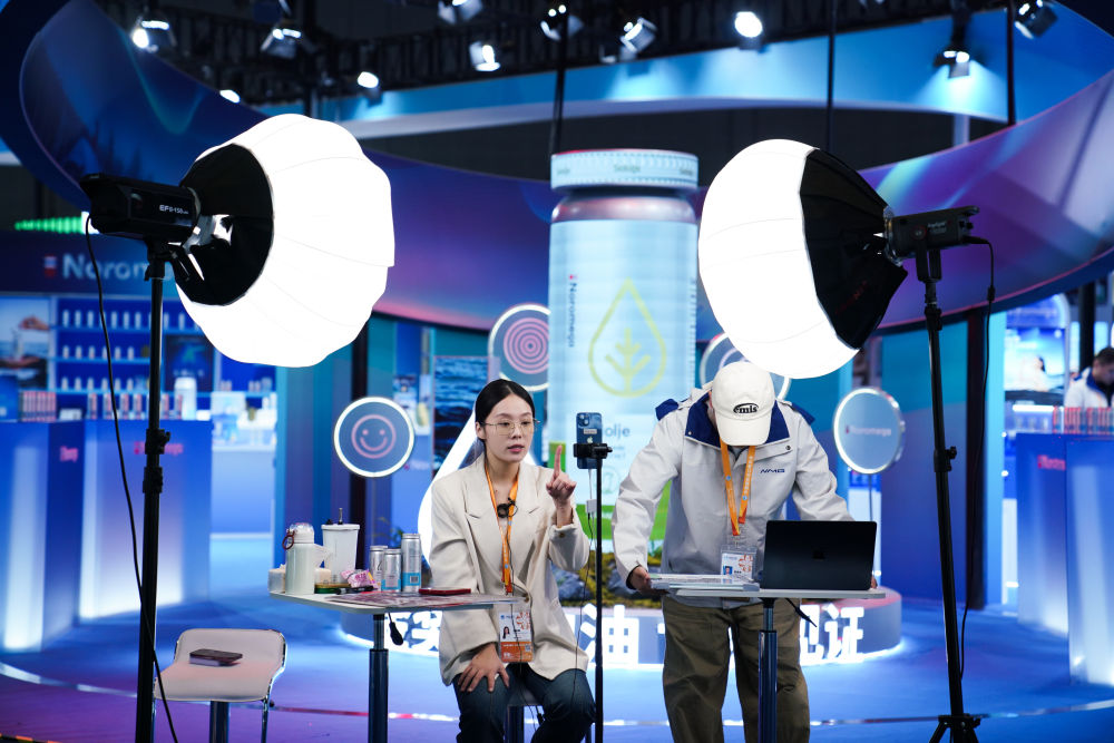 2025年11月4日,工作人員在第八屆進(jìn)博會(huì)醫(yī)療器械及醫(yī)藥保健展區(qū)直播。本屆進(jìn)博會(huì)直播密度大、形式多樣,有的展位專門搭建直播區(qū)域,燈光、背景、展板一應(yīng)俱全;有的展位手機(jī)一架、產(chǎn)品一擺,直播就地開始;還有的直播間是“流動(dòng)的”,達(dá)人主播們拿著手機(jī)、別著麥克風(fēng),穿梭于各個(gè)品牌展位間現(xiàn)場推薦……八年來,進(jìn)博會(huì)影響力逐年遞增,越來越多的中國消費(fèi)者愿意通過直播了解進(jìn)博會(huì)上的“全球好物”。