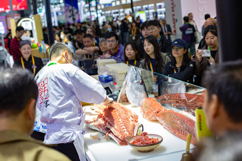 2025年11月7日,在第八屆進(jìn)博會(huì)農(nóng)食產(chǎn)品展區(qū),參觀者在一處展臺(tái)觀看開魚秀。工作人員當(dāng)場分切一條超過100公斤的金槍魚。英國奶酪、法國葡萄酒、意大利黑醋、馬來西亞榴蓮、厄瓜多爾巧克力、新西蘭乳制品、阿根廷牛肉……在本屆進(jìn)博會(huì)農(nóng)食產(chǎn)品展區(qū),多款“洋特產(chǎn)”亮相,展商現(xiàn)場加工、制作食品,供參觀者品嘗。