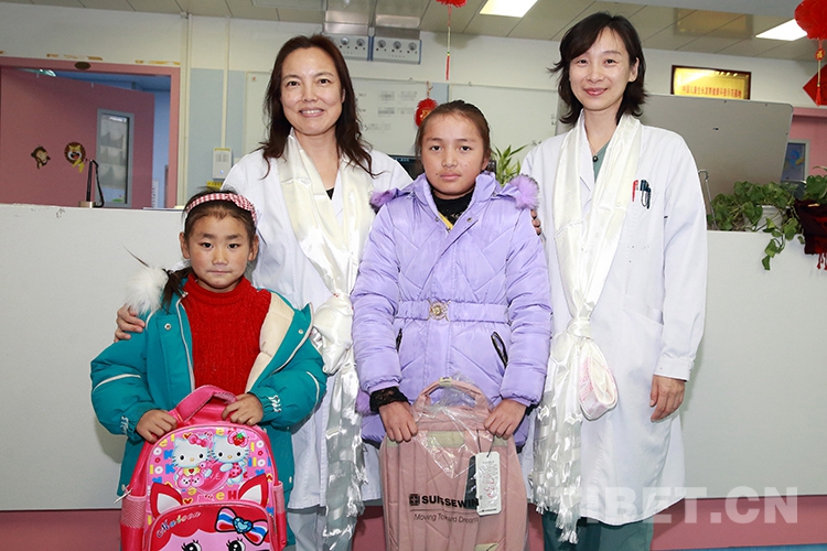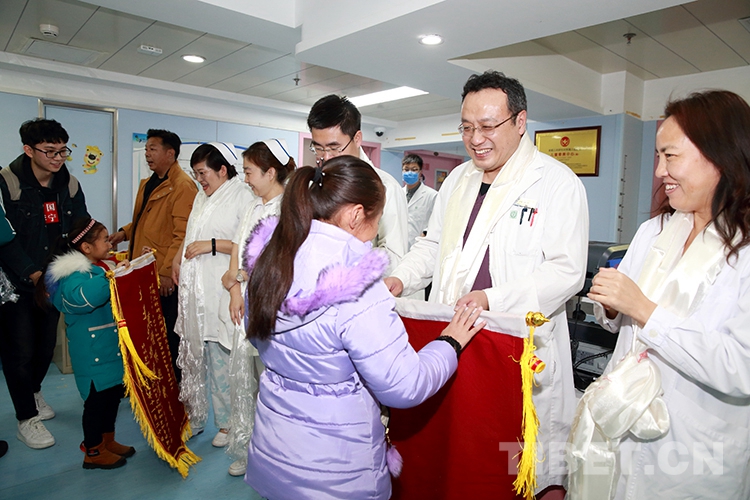 返鄉(xiāng)前,洛桑曲宗和次旦德吉在親屬和小學(xué)校長的帶領(lǐng)下來到兒研所,向醫(yī)護(hù)人員和共鑄中國心組委會的工作人員獻(xiàn)上了哈達(dá)和錦旗,表達(dá)感激之情。醫(yī)護(hù)人員也向兩個孩子贈送了書包等文具,鼓勵他們回校后好好學(xué)習(xí)。