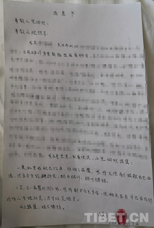 住院期間,索南吉的身份就是病人,對(duì)這個(gè)未知的疾病難免害怕,好的和不好的結(jié)局,她都反復(fù)想到了。作為一名參加過(guò)2003年非典和2010年甘肅舟曲特大泥石流一線(xiàn)救治工作的醫(yī)務(wù)工作者、有13年黨齡的共產(chǎn)黨員,她在住院的第2天,便向護(hù)士借來(lái)了筆和紙,在床頭向醫(yī)院鄭重寫(xiě)下了請(qǐng)?jiān)笗?shū):“一是如果我配合治療,戰(zhàn)勝了病魔,我將無(wú)償捐獻(xiàn)自己(的)血清,供醫(yī)療實(shí)驗(yàn)研究。二是萬(wàn)一病魔打倒了我,我將獻(xiàn)出自己身體,供相關(guān)醫(yī)療單位(開(kāi)展)具有針對(duì)性的實(shí)驗(yàn)研究,盡早攻克(新冠肺炎治療的)難關(guān)?!?/p>