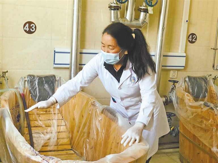 西藏自治區(qū)藏醫(yī)院藏醫(yī)藥浴中心工作人員正在更換一次性木桶套。