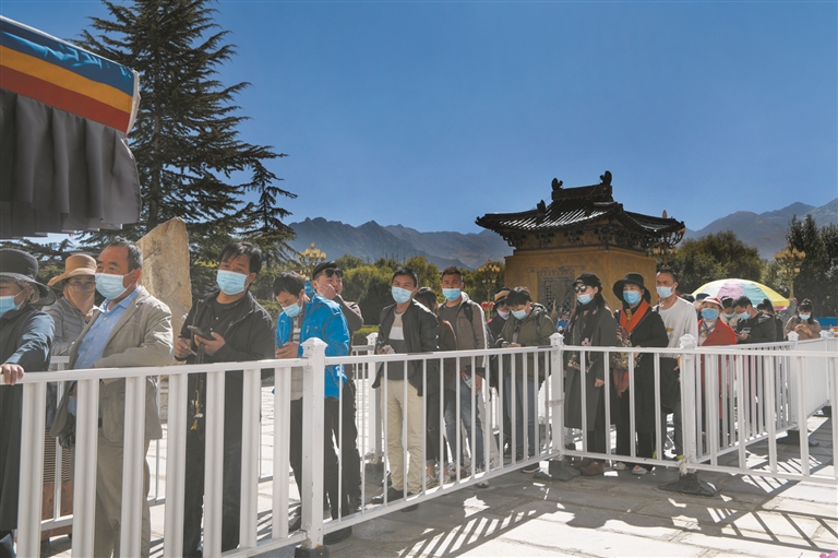 圖為游客佩戴口罩排隊進布達拉宮參觀。記者 貢嘎來松攝