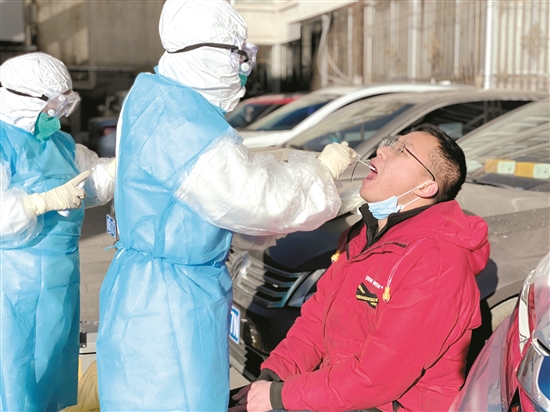 圖為拉薩市城關(guān)區(qū)衛(wèi)健委組織的核酸采樣人員正在為轄區(qū)內(nèi)重點(diǎn)崗位從業(yè)人員進(jìn)行咽拭子采樣。 記者 旦增拉珍 攝