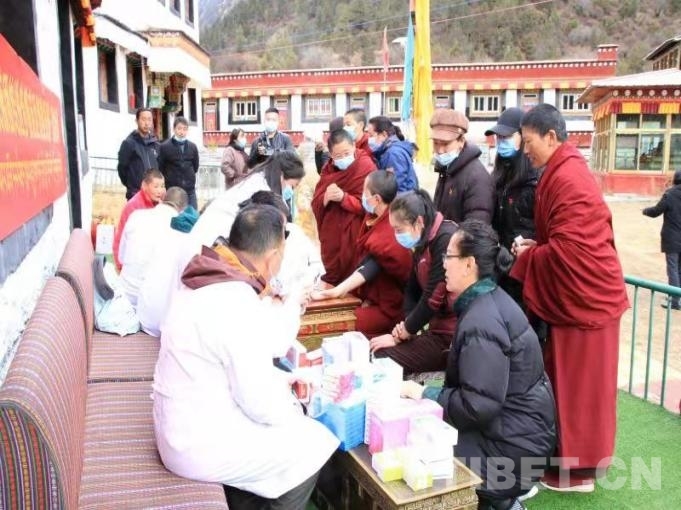 在古覺拉康,醫(yī)務人員為寺廟僧尼測血壓、診脈、健康咨詢、健康知識宣講,免費發(fā)放常用西藥、藏藥20余種及糖尿病、高血壓、肺結核等慢性疾病與新冠肺炎疫情防控宣傳資料;細致講解常見病、多發(fā)病的預防知識;針對不同病癥和個體差異提出合理的診療建議和治療方案。同時,還為僧尼發(fā)放了毛巾、牙膏、洗潔精等衛(wèi)生用品。