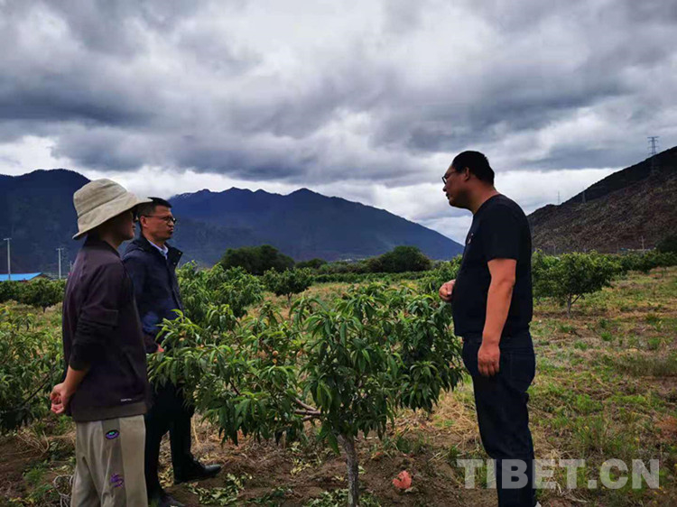 圖為李云海(右一)與工作人員一起探討桃樹栽種問(wèn)題