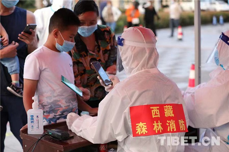 圖為西藏自治區(qū)林芝市森林消防支隊消防員在核酸采集點查看群眾健康碼