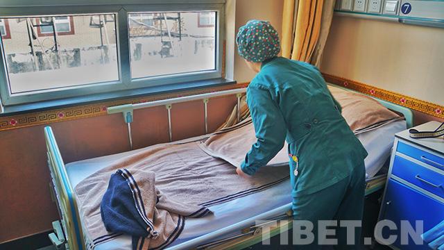 圖為護理人員正在為病人鋪床,患者浴后需要躺臥發(fā)汗
