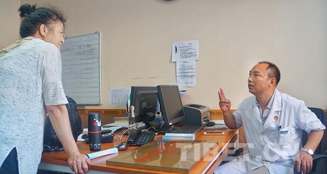 圖為王多吉正在同患者交流治療方案。(中國西藏網(wǎng) 記者/楊悅笙)