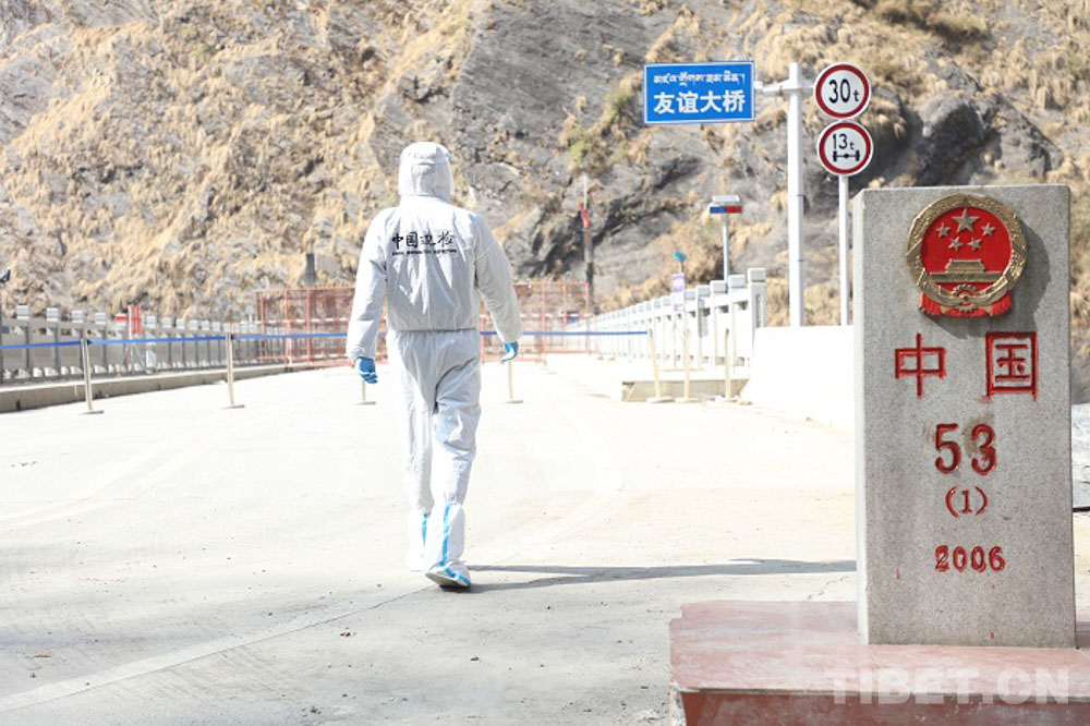 圖為防疫人員在友誼大橋前 攝影:蘇宏廣