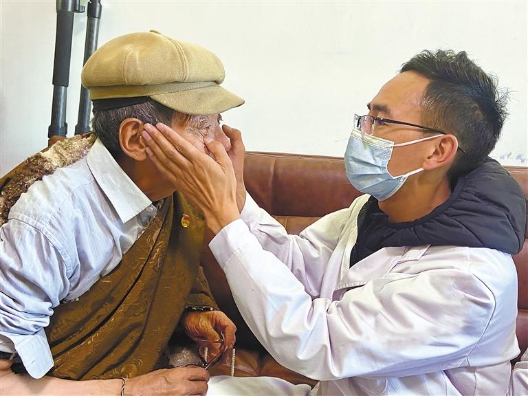 圖為來自色尼區(qū)藏醫(yī)院的志愿者阿旺格桑(右一)正在為老人檢查身體。記者 萬靖 攝