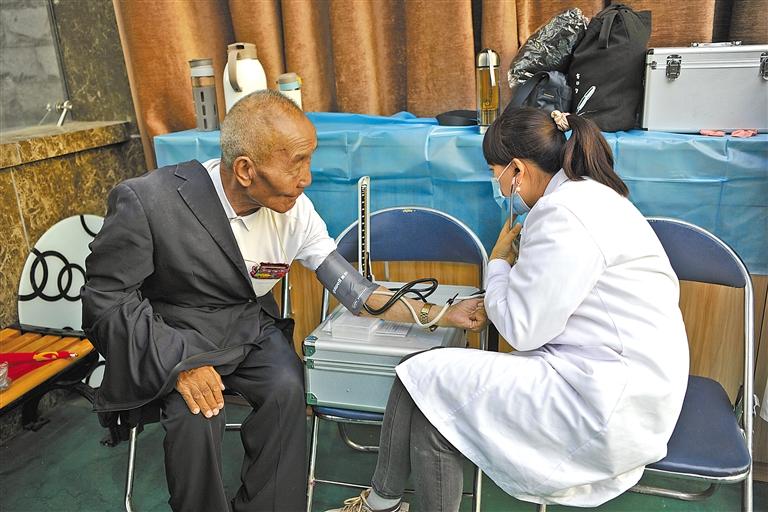 圖為醫(yī)護(hù)人員在為退休干部測量血壓。記者 旦增蘭澤 王敏 攝