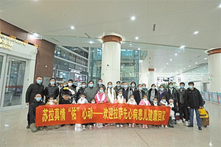 圖為相關(guān)領(lǐng)導(dǎo)與患兒以及家長(zhǎng)在機(jī)場(chǎng)合影。記者 拉巴桑姆 攝