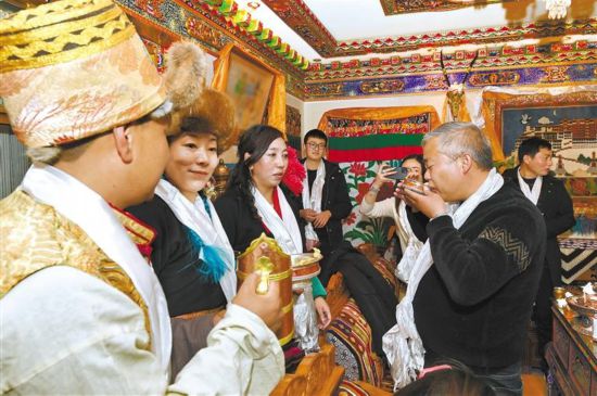 游客們在拉薩市城關區(qū)奪底街道維巴村體驗藏歷新年的別樣風俗。記者 格桑倫珠 唐斌 攝